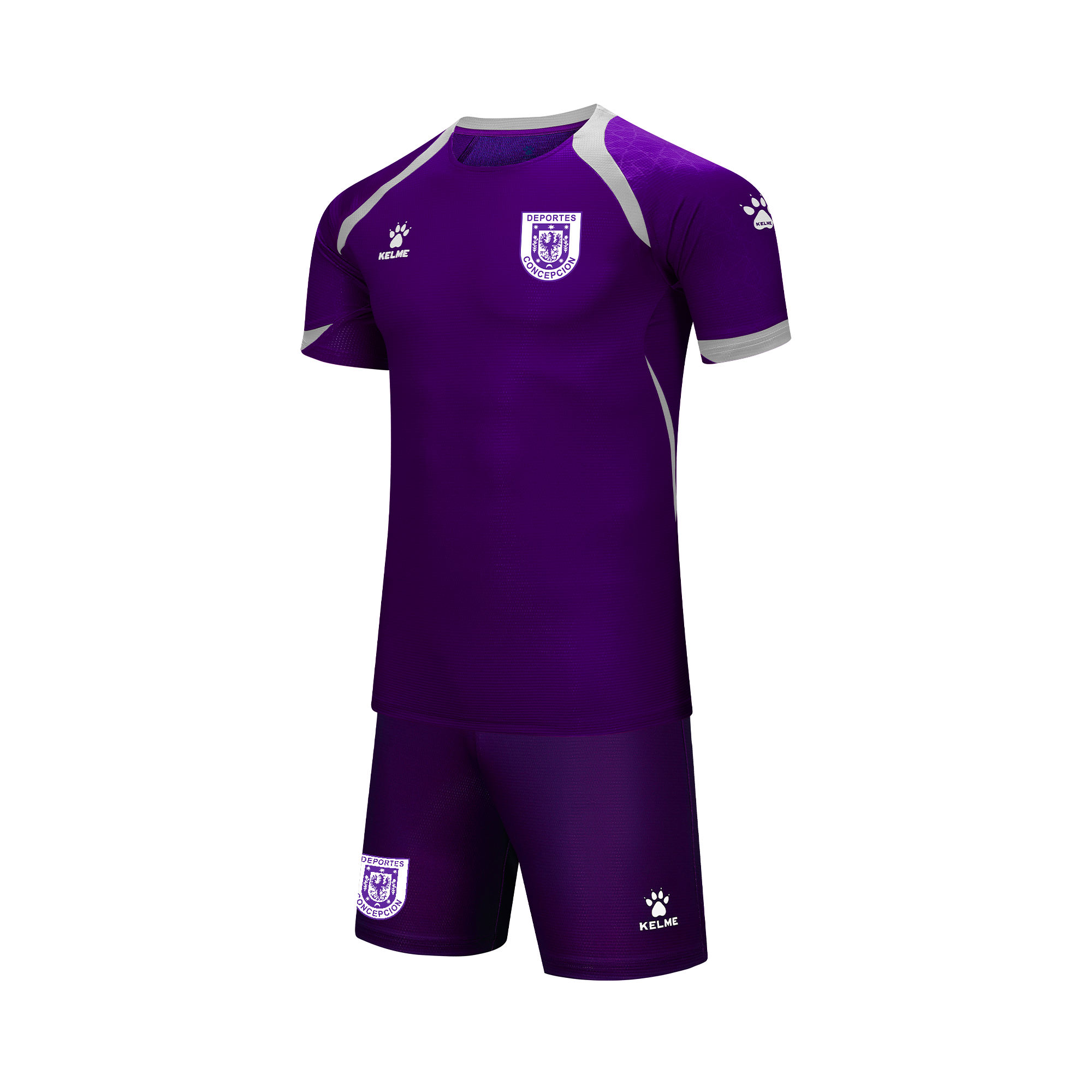 Compuesto por camiseta de manga corta y short, este set presenta un diseño moderno en color lila, con detalles en contraste en los hombros que aportan dinamismo y estilo deportivo. Al frente destaca el escudo de Deportes Concepción, mientras que el logotipo KELME completa el diseño con un sello técnico y profesional.