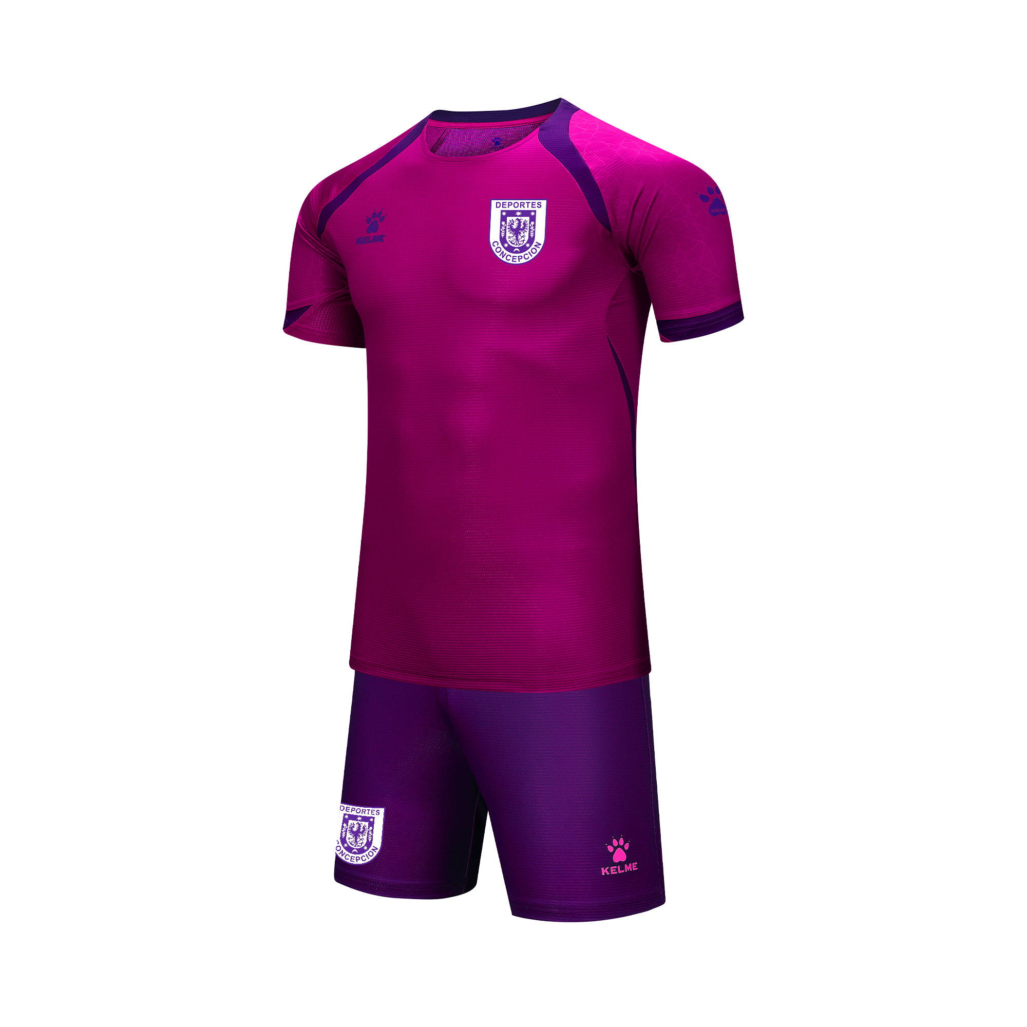 Compuesto por camiseta de manga corta y short, este set presenta un diseño moderno en color lila, con detalles en contraste en los hombros que aportan dinamismo y estilo deportivo. Al frente destaca el escudo de Deportes Concepción, mientras que el logotipo KELME completa el diseño con un sello técnico y profesional.